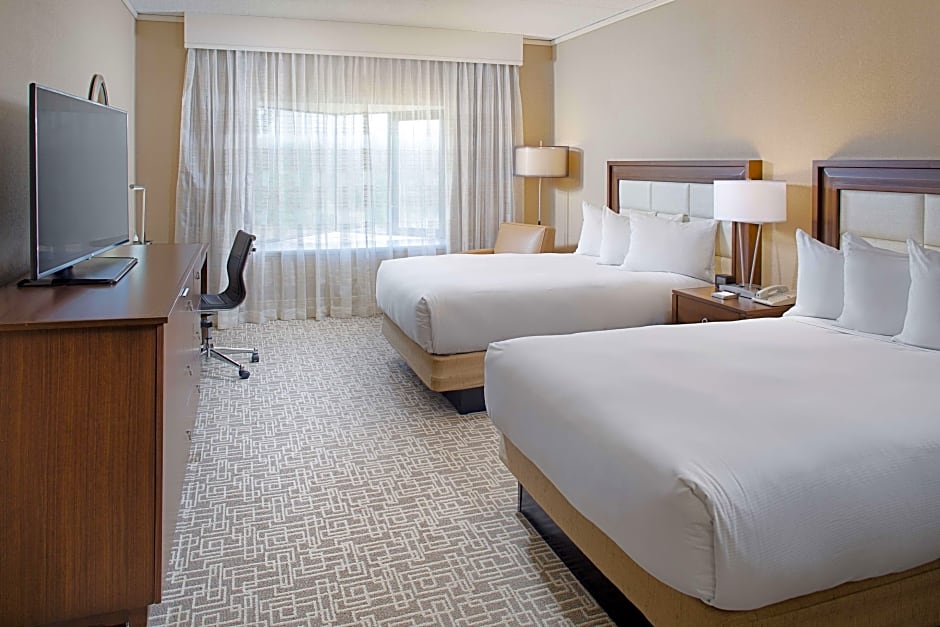 42sqm/450sq. ft., 2 double beds, work desk, 42-inch TV, WiFi Relax in this spacious 42sqm / 450sq. ft. guest room with 2 double beds. Get to work at the desk, stay connected with WiFi or catch a movie on the 42-inch flat-screen TV. Refresh in the stylish bathroom and rest in comfort with the Hilton Serenity Bed which features luxurious, allergen-free down comforter and pillows, elegantly striped 250 thread count sheets.