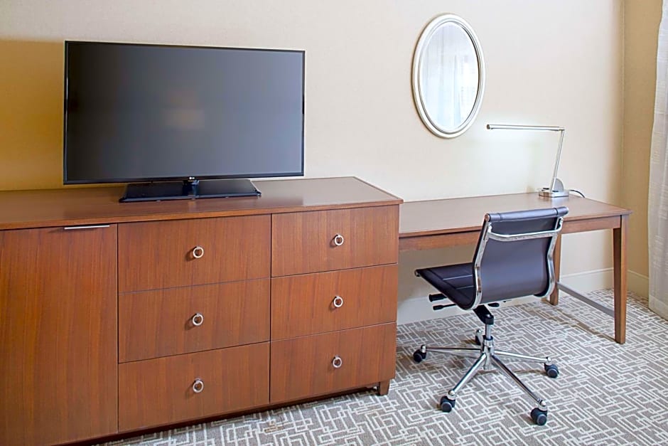 Our mobility accessible single king bed guest rooms feature dark woods and rich colors. The room also features an accessible tub with grab bars. Each guest room offers a 42-inch flat-screen TV, Hilton Alarm Clock Radio with MP3 connection, chair and ottoman, work desk, two-line phones with voicemail, coffee maker, iron, ironing board, and a hair dryer. Pamper yourself in our handsomely appointed bathroom with marble floors and countertop, and signature bathroom amenities. Each guest room features items from the Hilton Serenity Collection. The Serenity Bed includes an exclusive mattress and box springs, mattress pad, down-filled comforters, down pillows, Egyptian cotton sheets and a duvet cover. Any corresponding photo may not reflect the specific accessible room type or room feature.